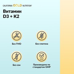 Содержит смесь витаминов D3 и K2Поддержка костей и сердечно-сосудистой системы*Синергетическая формула*Не содержит глютена, ГМО и сои